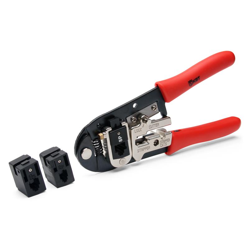 Профессиональный ручной инструмент, предназначенный для опрессовки RJ-разъемов, перерезания проводов, в также удаления изоляции с плоских телефонных и круглых проводников (UTP, STP).